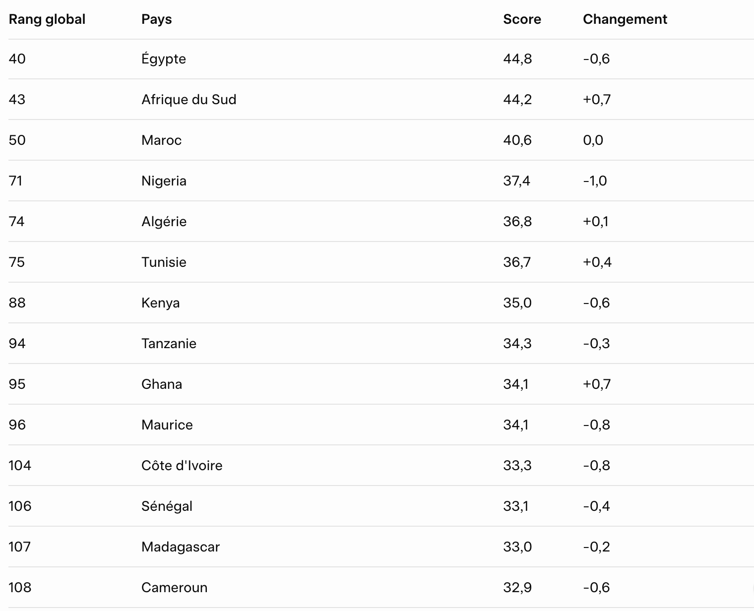 Le pays de la Téranga enregistre un score de 33,1, en baisse par rapport à 2025 où le pays était évalué à 33,5 et figurait à la 102e place. En Afrique, le Sénégal passe de la 11e place à la 12e place. Sur le continent, l'Égypte est en tête, suivie de l'Afrique du Sud, du Maroc et du Nigeria. L'Algérie complète le top 5.
